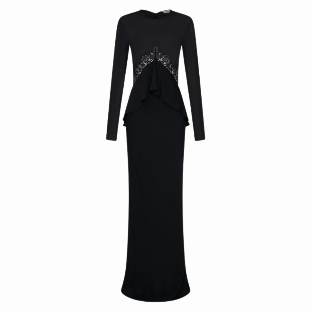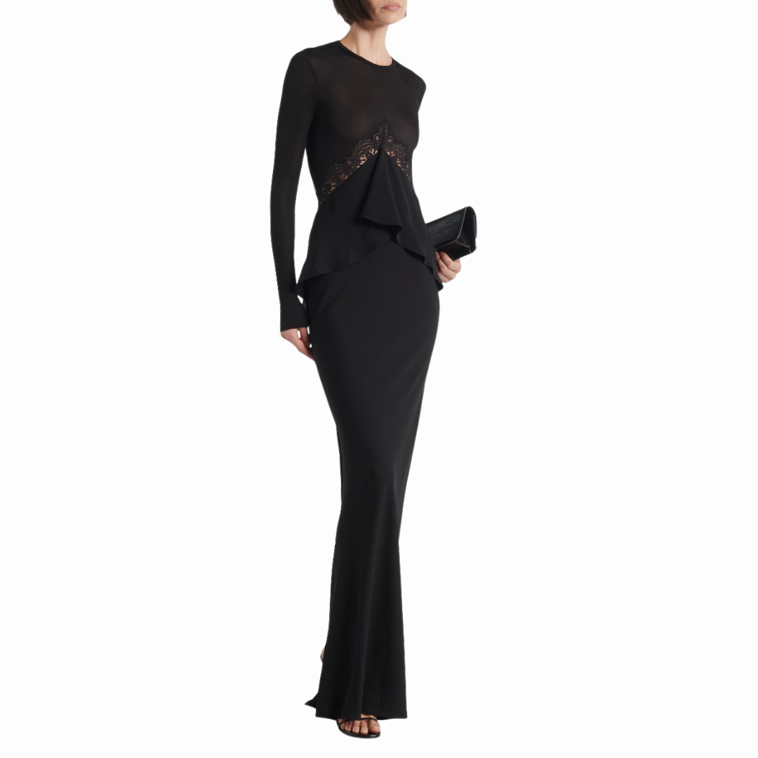 Pragmatic & feminine details combine to form this lace disconnect back column dress. Fine rib stretches with ease to the body, whilst sheer lace traces the torso. Tonal lace insert panels frame the bodice and trace a sculpted open back.