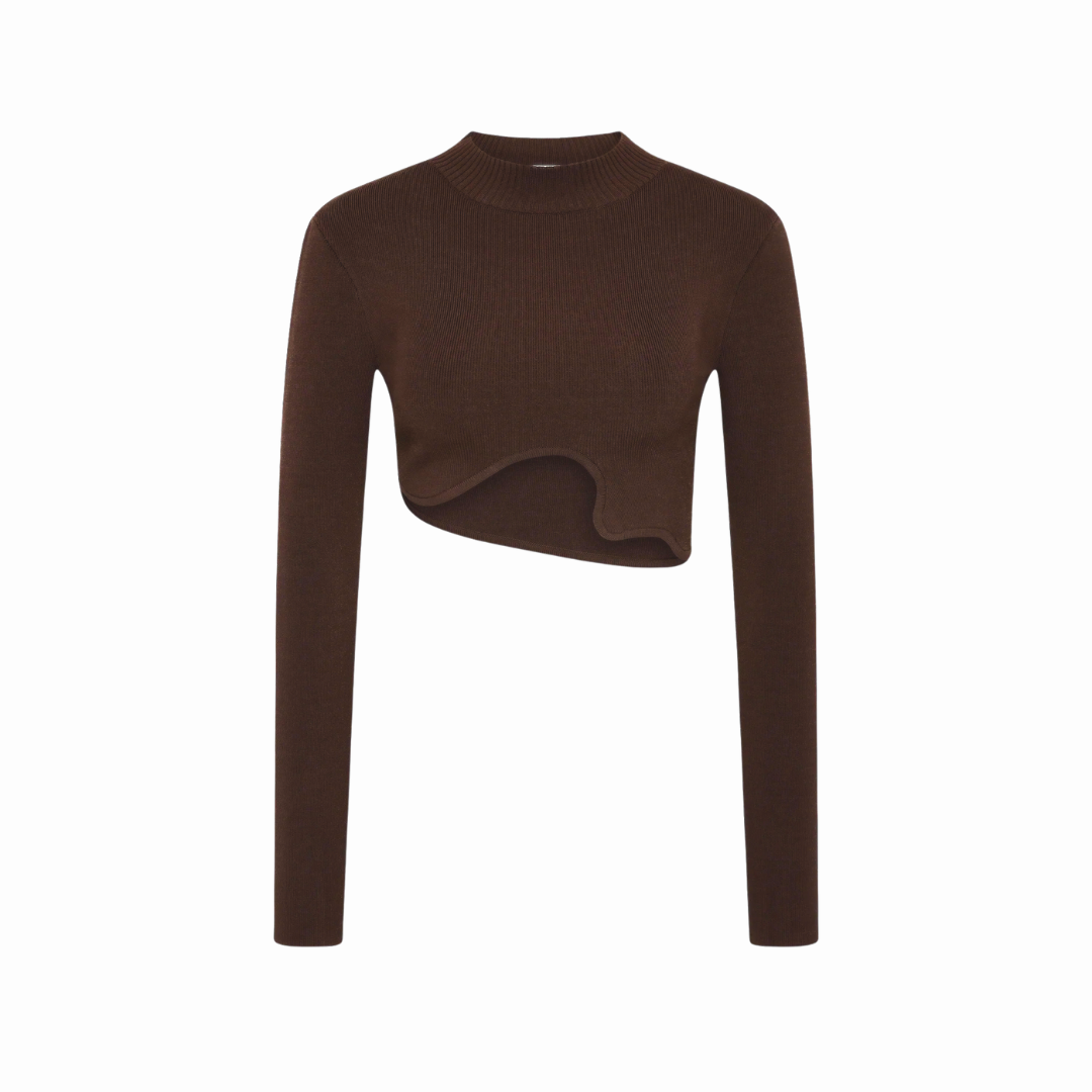 Crafted in compact rib, the cropped profile features a crew neckline and extended sleeves for contrast, offering directional ease when styled back with the matching cutaway skirt. A fluid arc cuts through the compact rib, framing the torso in a cropped, sculptural silhouette.