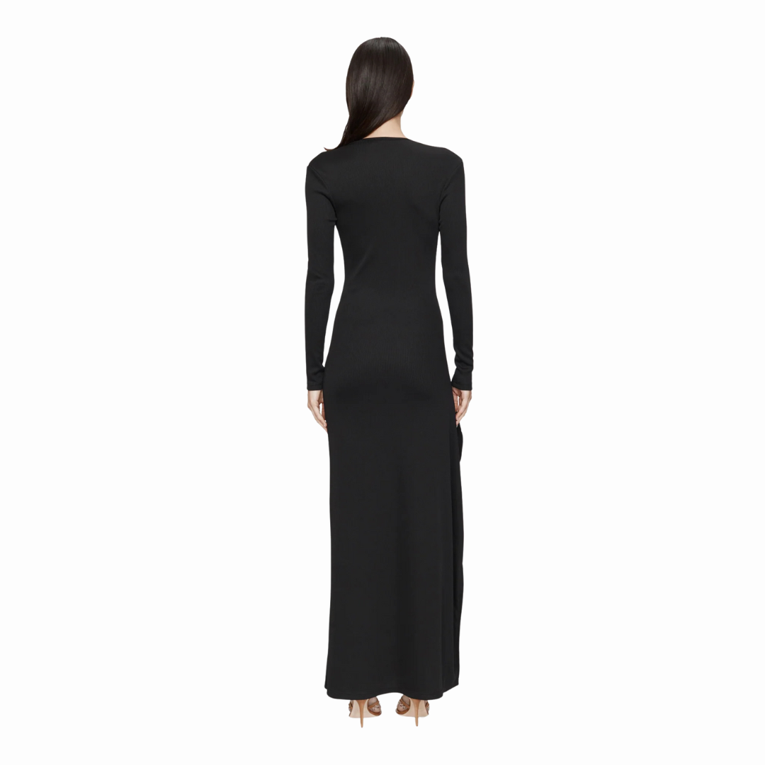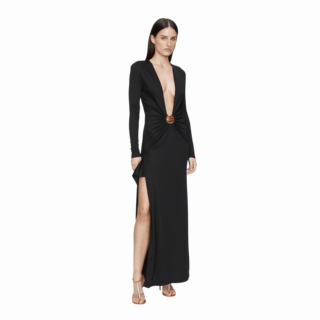 Cut in a fine rib jersey, the Mineral Stone Cascade Long Sleeve Dress features a deep V neckline, gathered draping through the waist and a circular hardware accent at the centre front. A domed mineral stone is set in gold-toned hardware, anchoring the silhouette with sculptural weight.