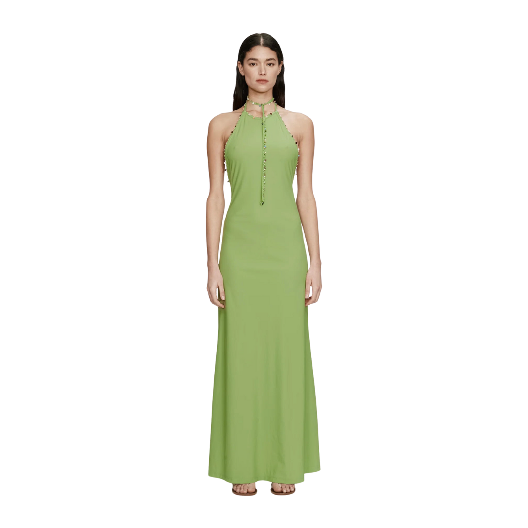 The Beach Quartz Halter Lycra Dress is cut from smooth stretch lycra that traces the body before falling to a fluid full-length hem. Framed by a halter neckline with cascading ties, the silhouette is embellished with hand-applied natural stones for a refined finish.