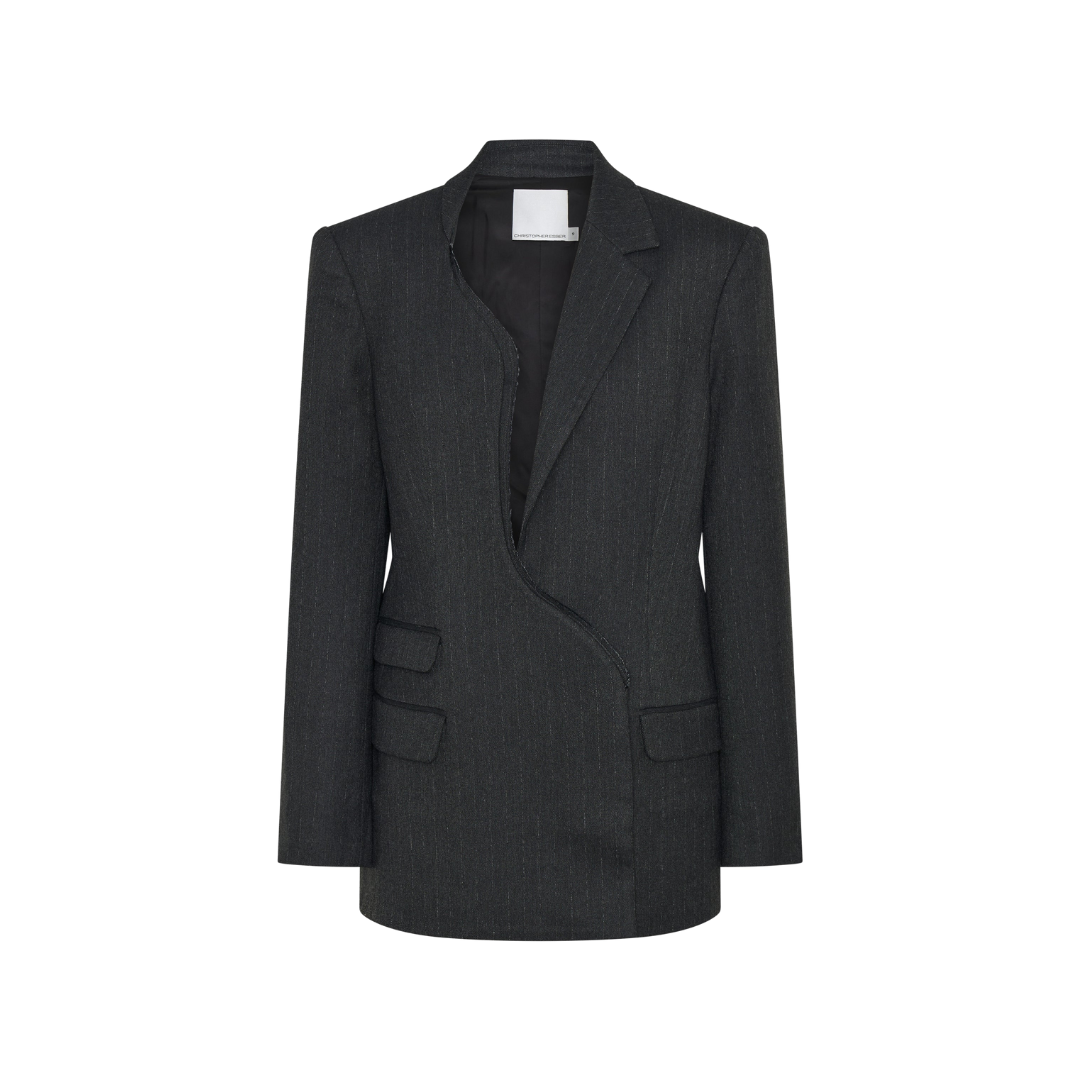 The Torrent Pinstripe Blazer cut in classic charcoal pinstripe wool with an asymmetric front closure that curves along the body. A single exposed zipper runs the length of the front, interrupting traditional suiting lines. Sharp shoulders and flap pockets anchor the silhouette with structured precis