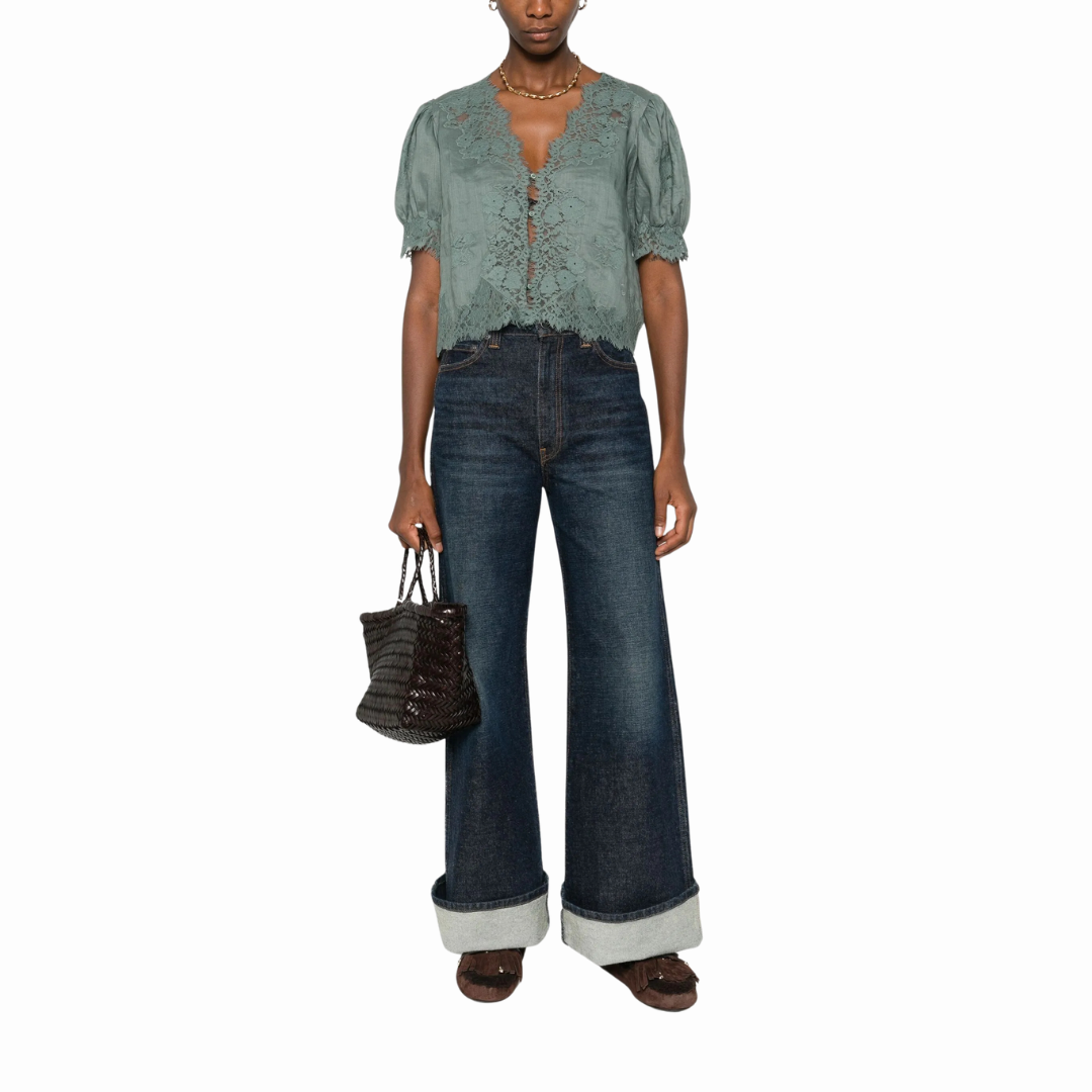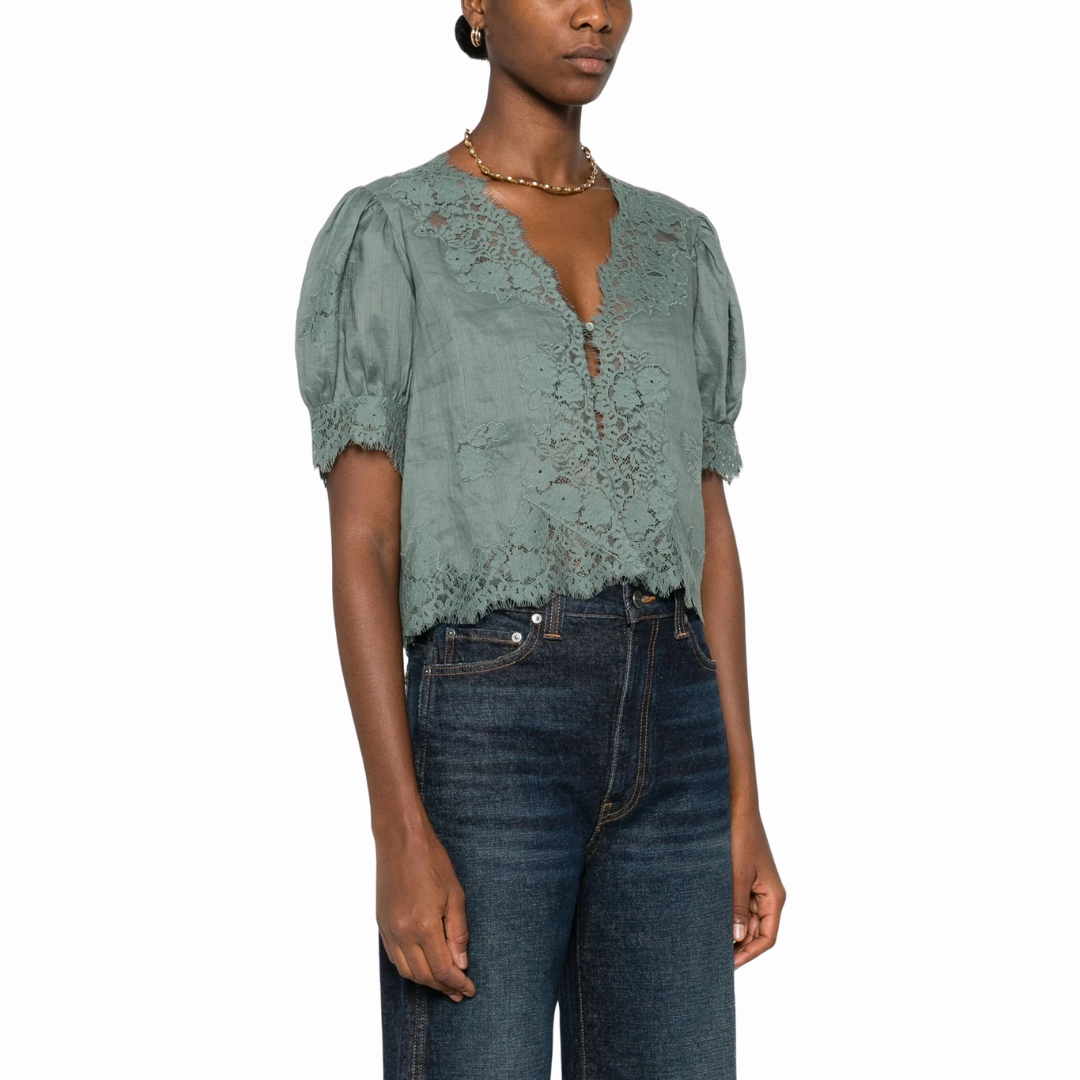 Crafted from crisp, lightweight ramie, the antique-inspired DÔEN Heirloom Idella Top features a plunging V-neckline, short puffed sleeves, and a breezy cut. Intricate embroidered floral lace trims the neckline, sleeve cuffs, center front placket, and slightly cropped hemline, while lace insets adorn the sleeves and bodice. An embroidered “D” emblem finishes the front left hem, and a line of mother-of-pearl buttons extends down the front.