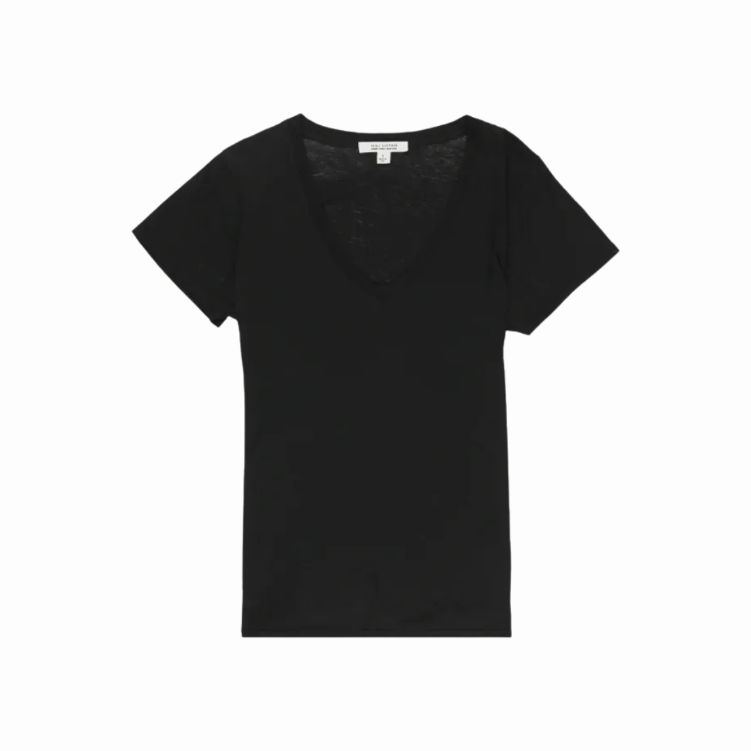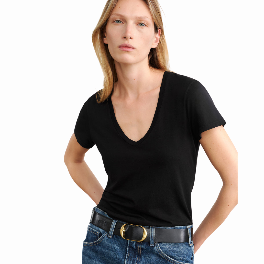 Relaxed fit v neck short sleeve tee shirt in premium American cotton. Vintage pitch short sleeve. Self-binding along neck and sleeve.