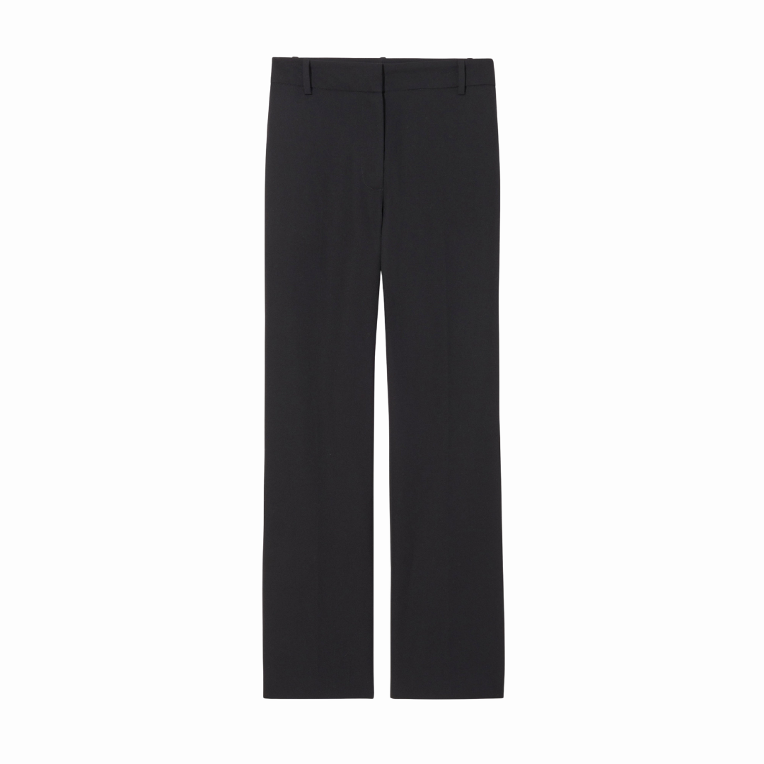 Flat front, high-rise straight leg trouser in Italian non-stretch wool. Fitted through hips. Zip fly. Hidden hook-and-bar closure. Hidden stay button closure. Belt loops. Back welt pockets.