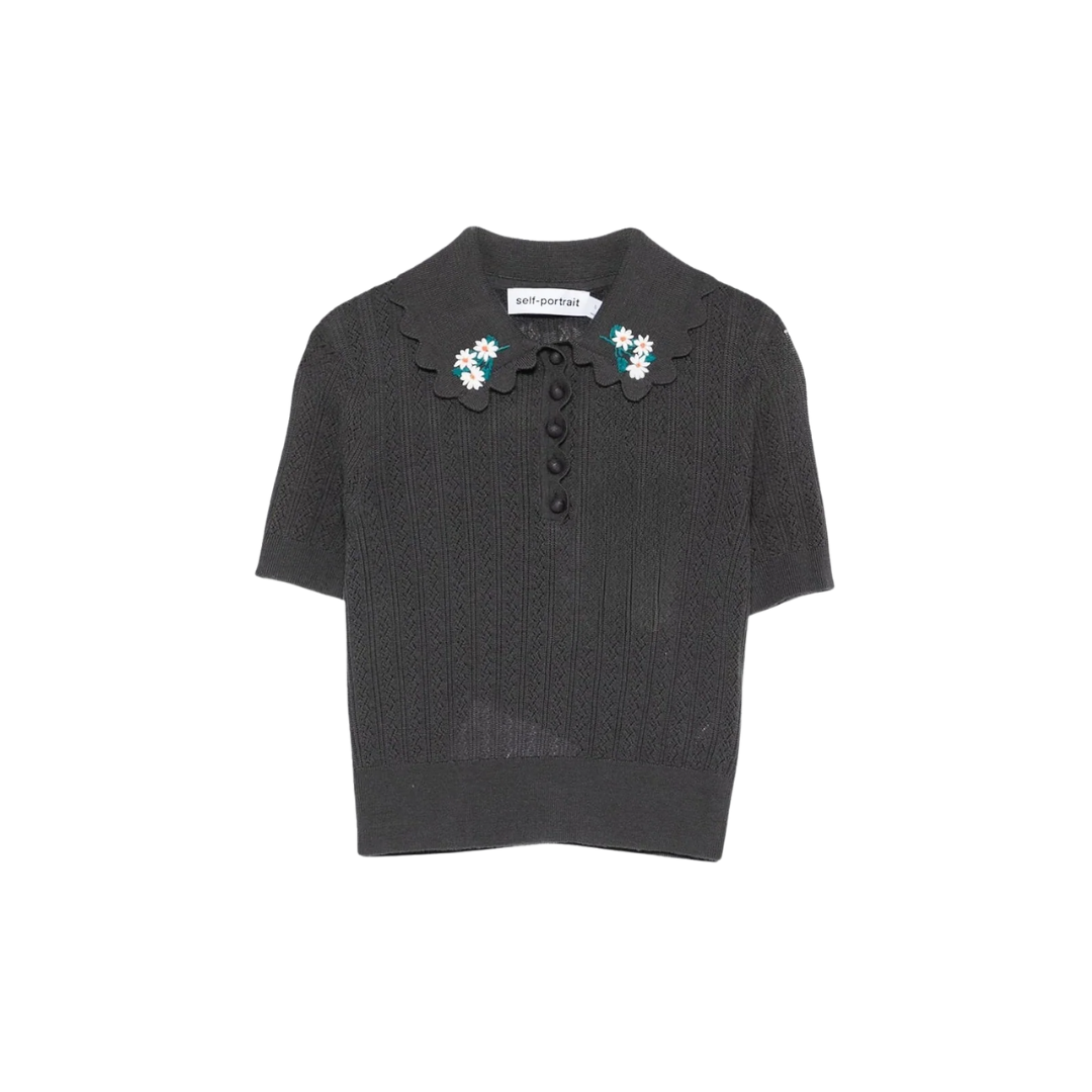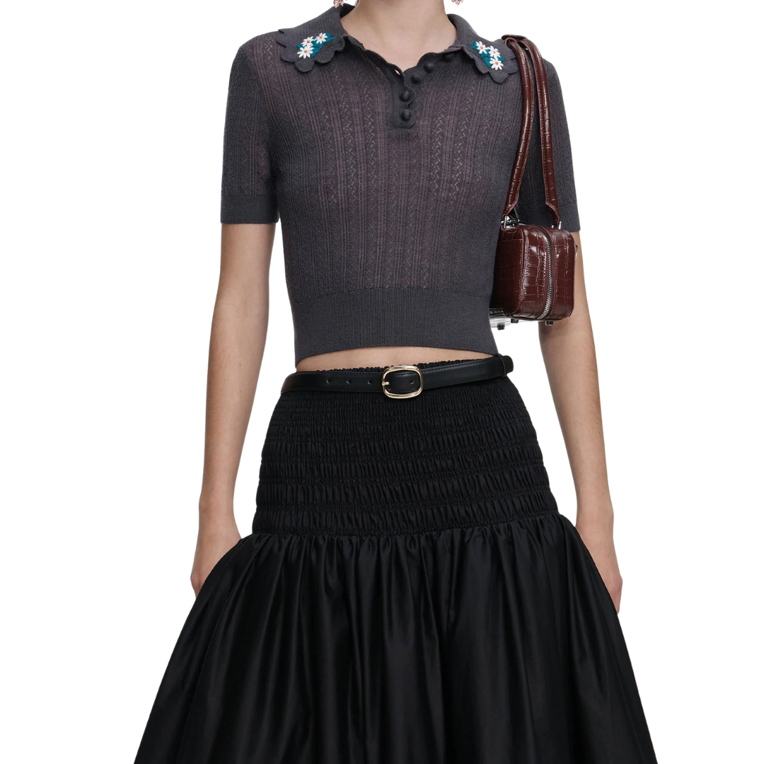 A revere collar accented with embroidery elevates this grey pointelle knit top beyond the ordinary. Cut with a bodycon cropped fit, style it up with high-waisted denim and sleek midi skirts alike.