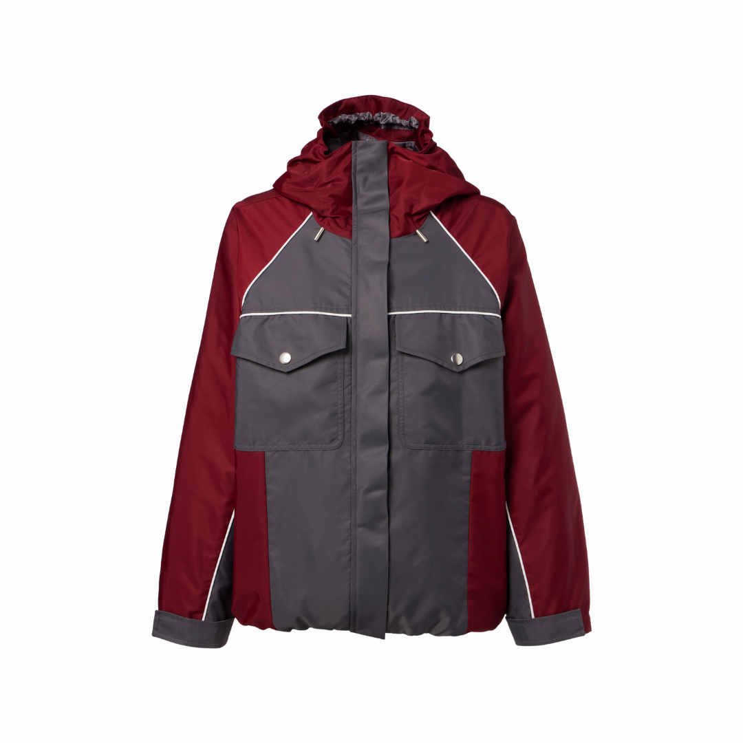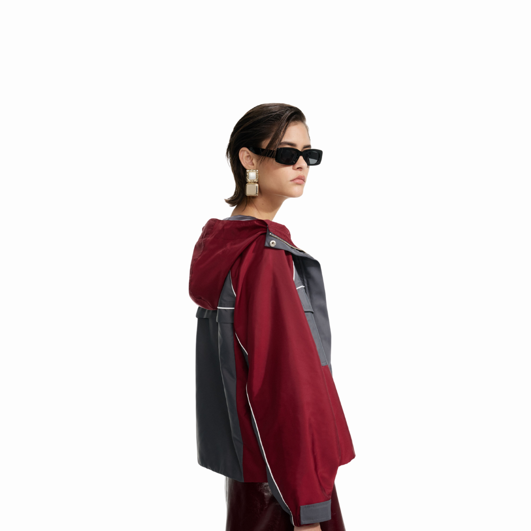 Sporty meets chic in this grey & burgundy nylon windbreaker, which boasts athletic details like an exaggerated hood and elasticated waist. Style it over a t-shirt and micro shorts for date night