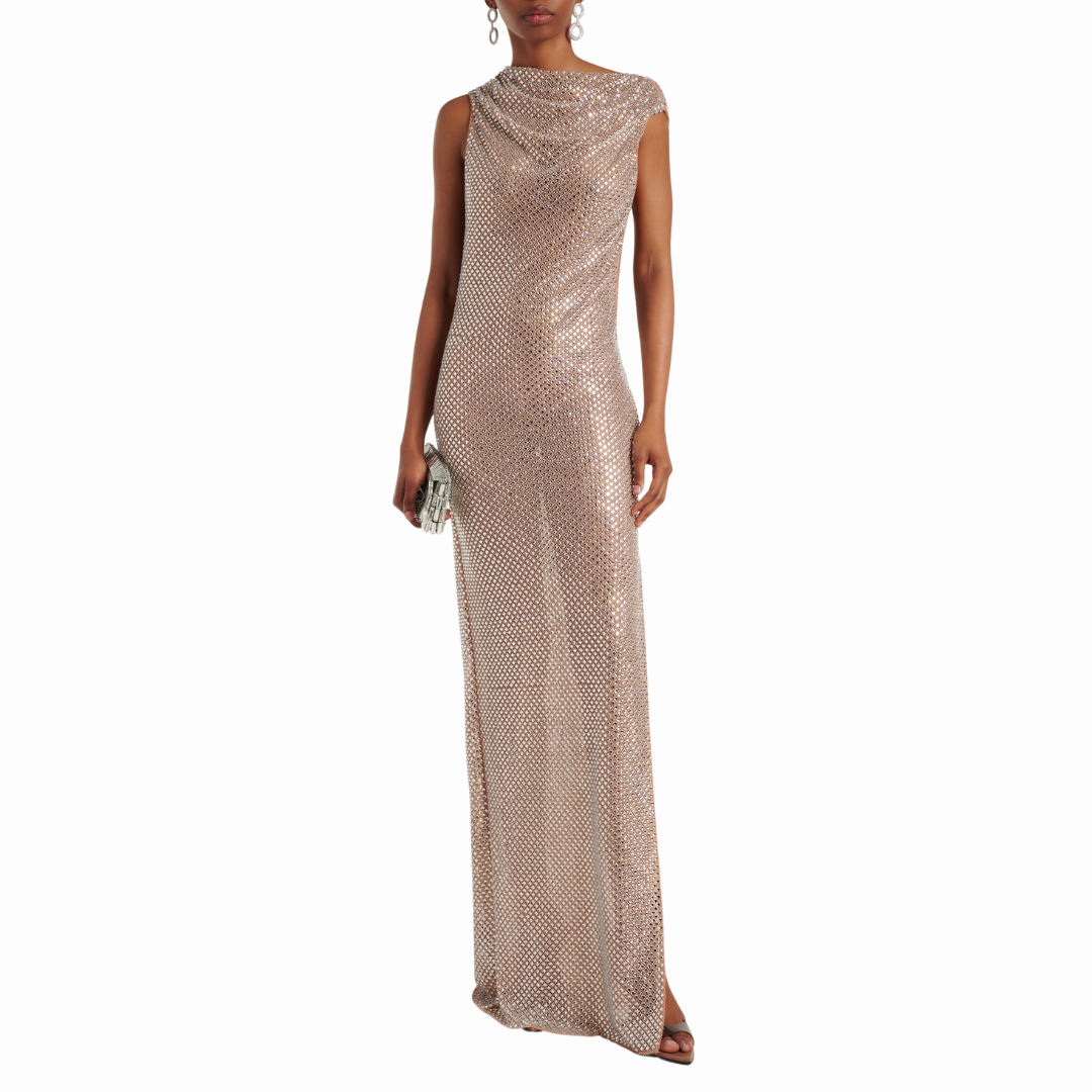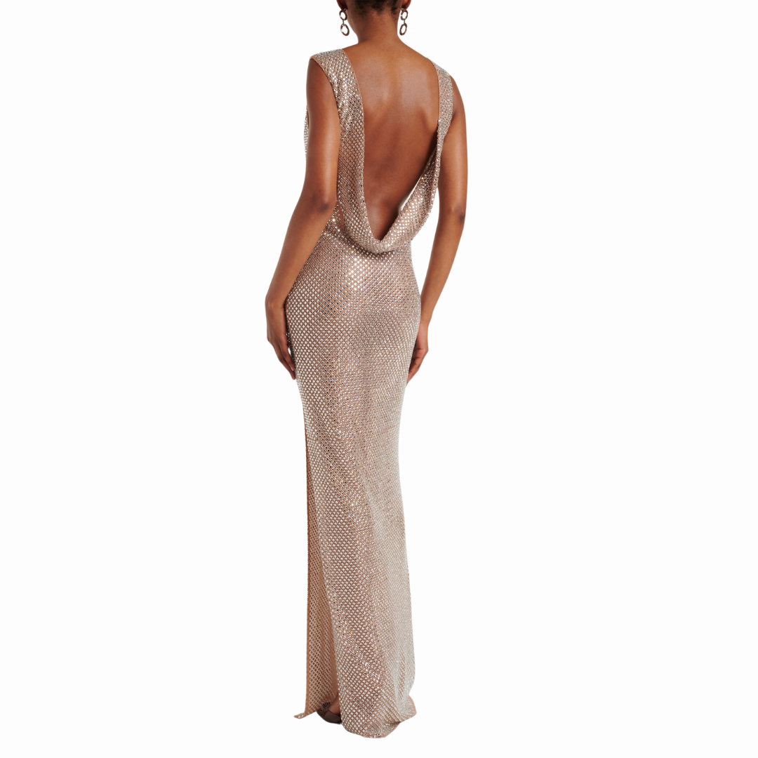 Conquer the town in this rhinestone fishnet dress which shimmers from its draped neckline down to the maxi hem. A cowl back and side slit add dramatic flair – style with heels to dance until dawn.