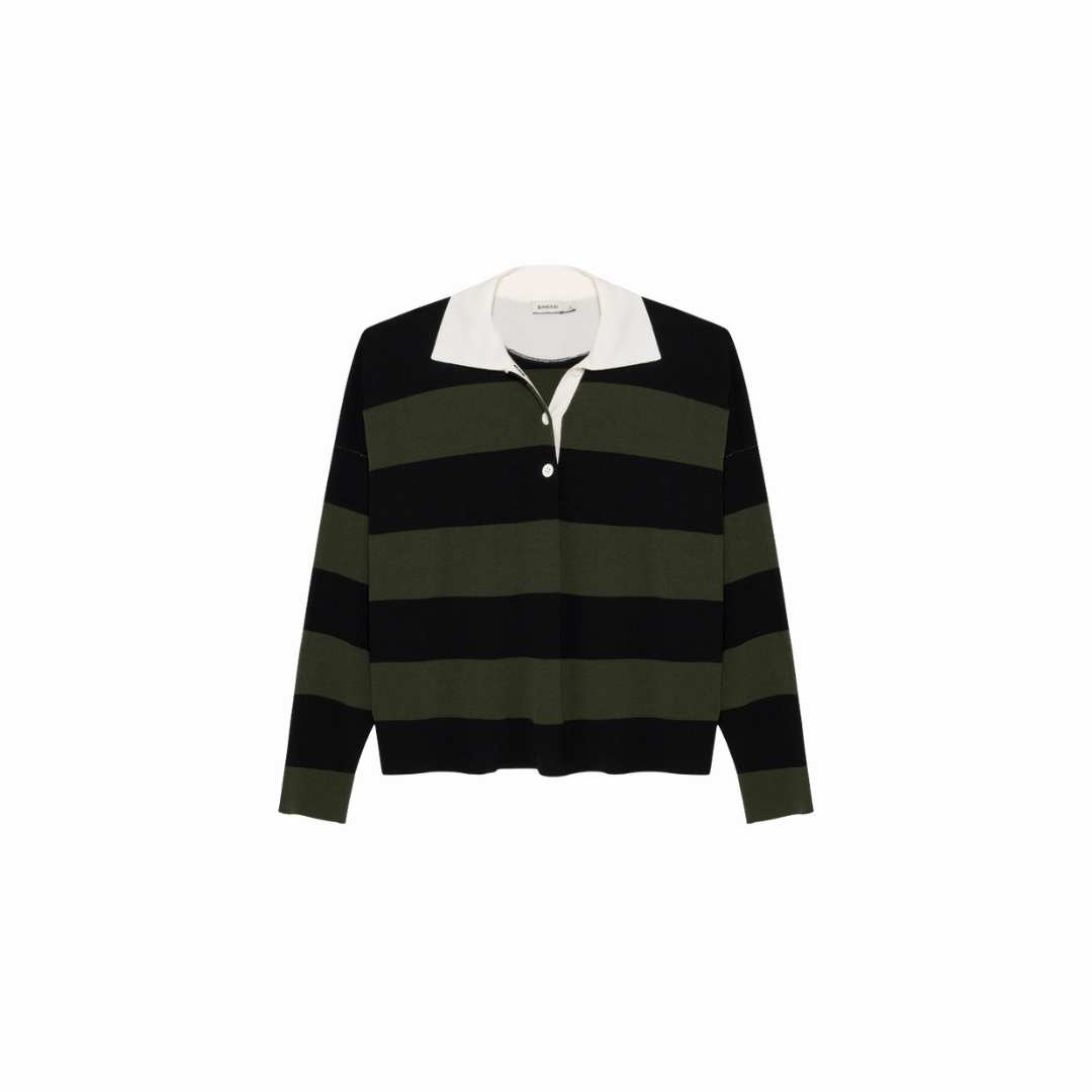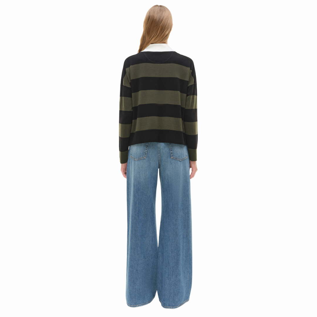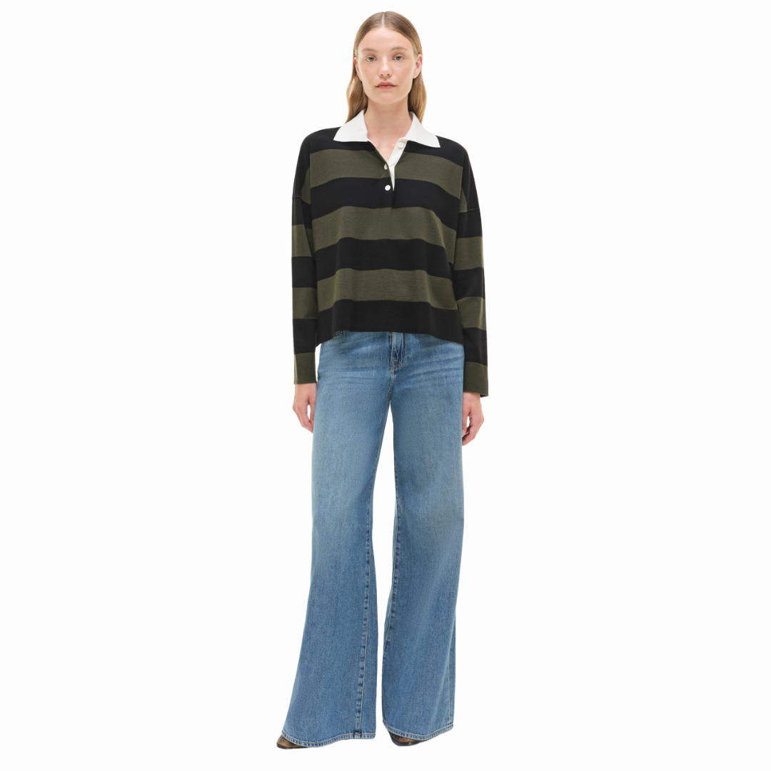 A featherweight wool rugby polo featuring a contrasting spread collar, long sleeves, and a boxy, cropped cut.