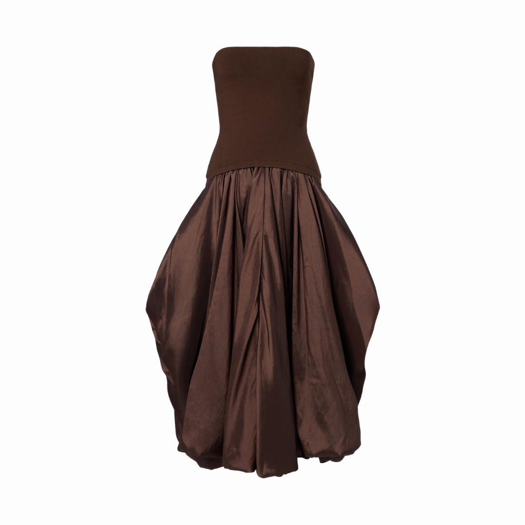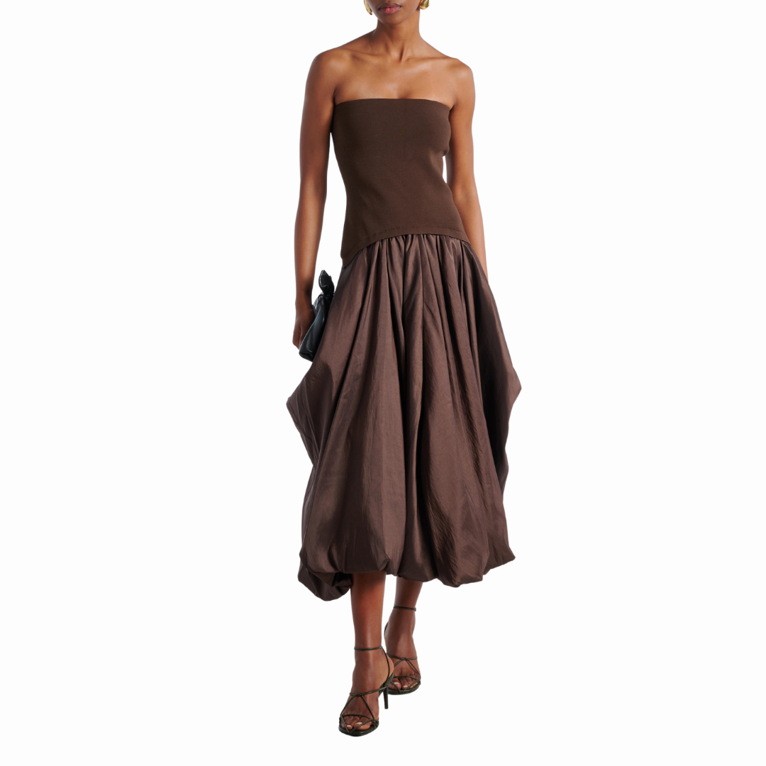 The Izzy Strapless Taffeta Midi Dress in Cocoa