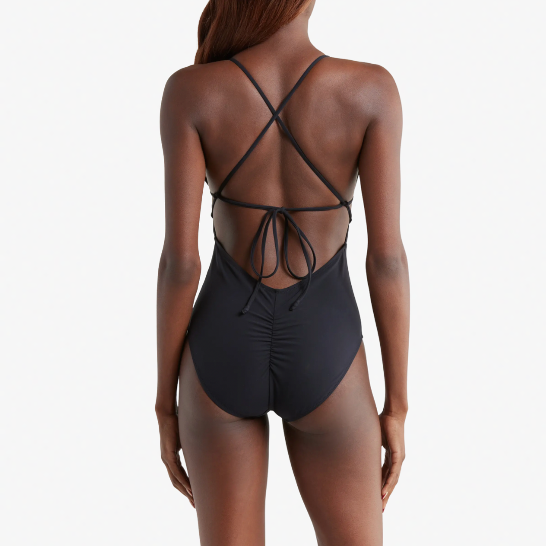 Take a refreshing dip in this solid one-piece swimsuit designed with a plunging neckline and slender cross-back straps.